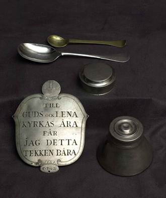 Undersidan av kalk av silver 1943 med stämplar, Essinge kyrka, Stockholm Diverse småföremål från Lena Kyrka, Vattholma pastorat.. Foto AJvP Foto AJvP